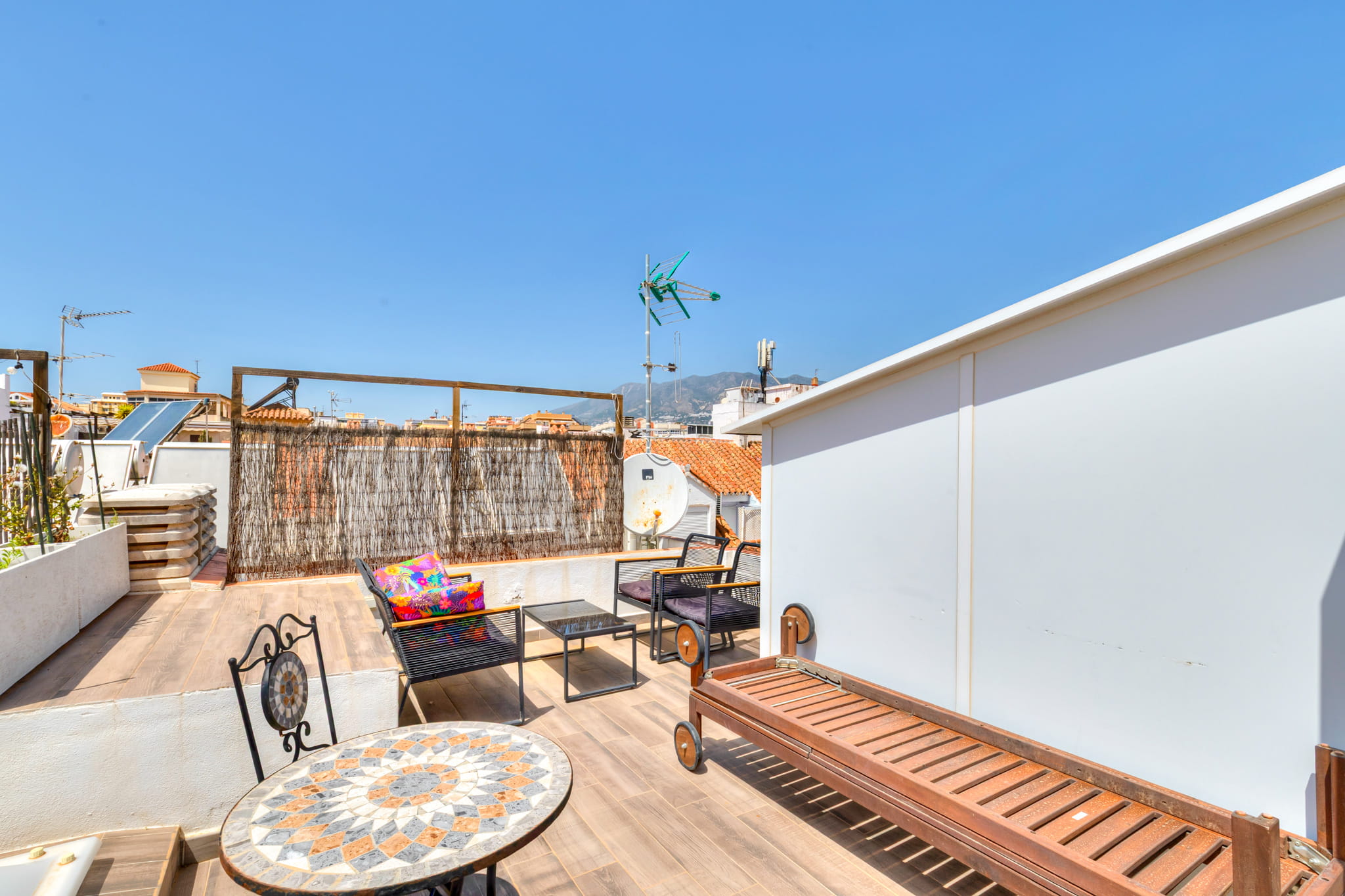 Desde el salón también se accede por una escalera a la terraza privada en la azotea, con espacio para tumbonas y sofás, y con preciosas vistas a la montaña.
