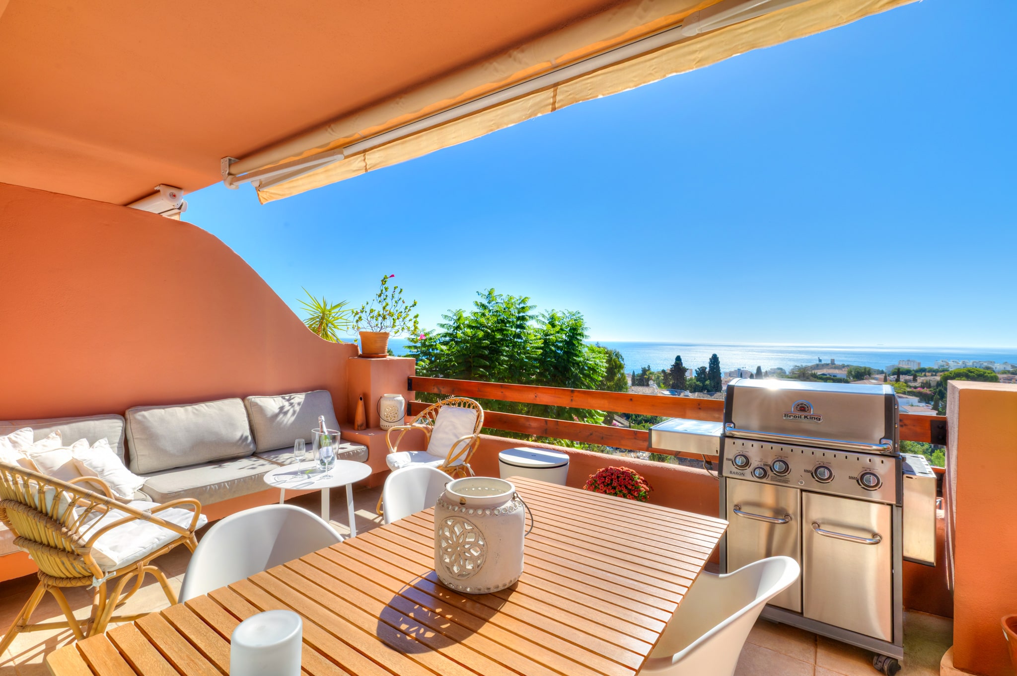 För att komma till den privata takterrassen tar man trappan eller hissen upp en våning och väl uppe så slås man igen av just utsikten och här finns gott om plats för att njuta av det spanska vädret. Här finns solsängar, utekök, matbord och en loungedel.