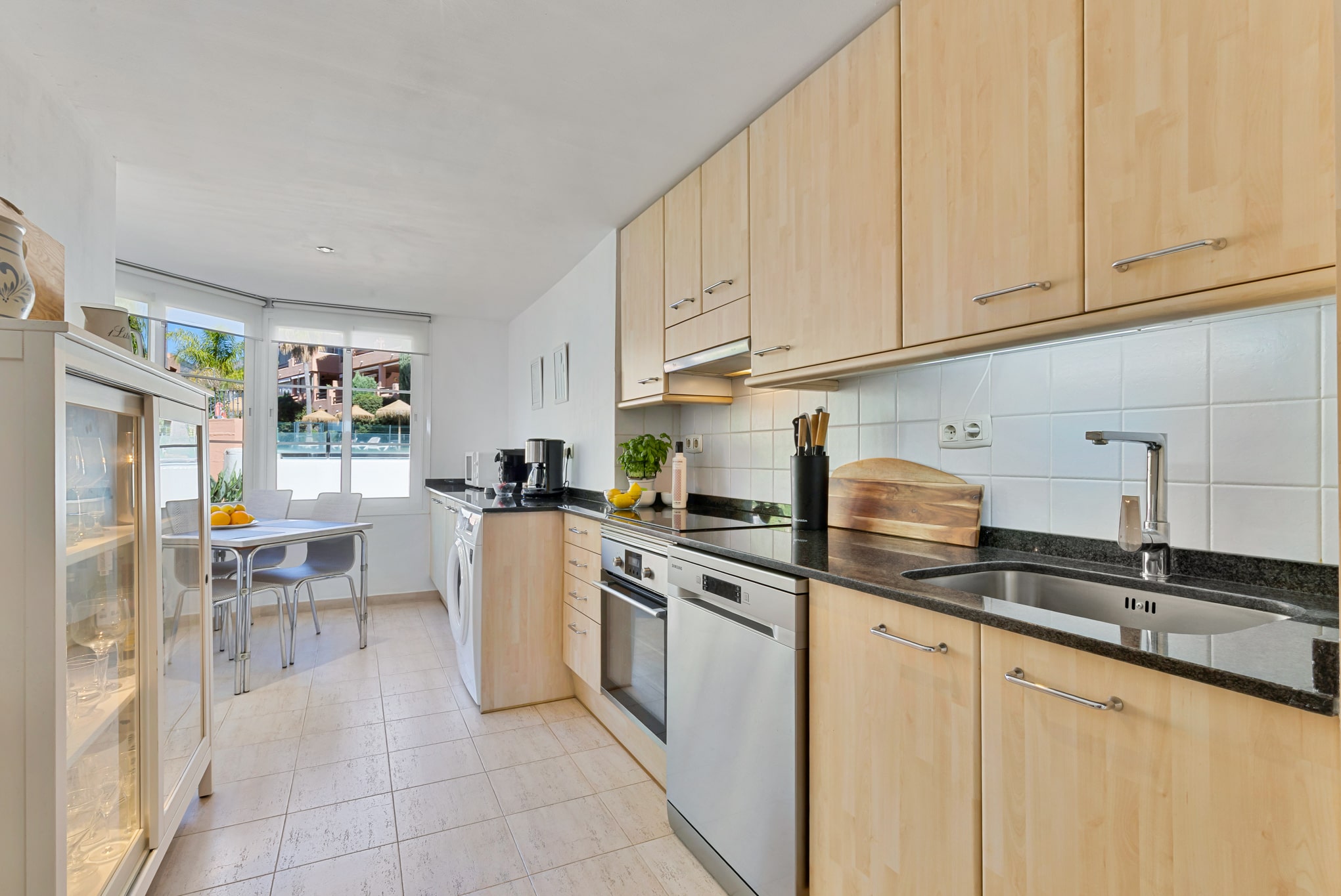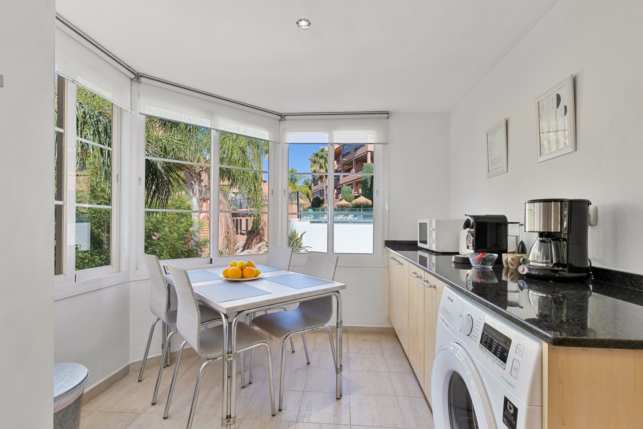 Till höger finns ett fullt utrustat kök med matplats och stora fönster ut mot den gemensamma trädgården och en av områdets pooler.