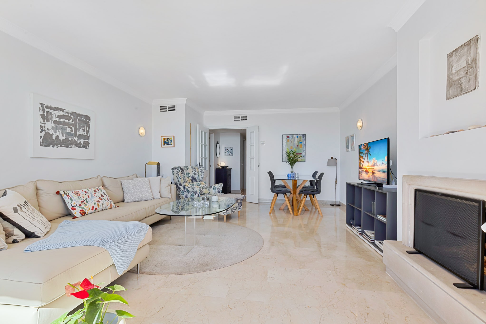 Till vänster från hallen finns vardagsrummet med öppen spis och glasdörrar ut mot terrassen på 22 m2 med platsbyggd soffa och plats för matbord, grill och växter. Och sa vi att terrassen bjuder på en fantastisk utsikt ner mot havet och Fuengirola?!
